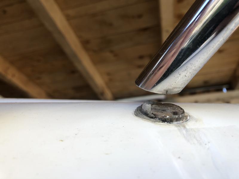 So wie das aussieht ist das Teil was noch am Boot fest ist normalerweise mit Hartlot fest gelötet in dem Steher und nach unten verschraubt. Solltest Du irgendwo in der Kabine so einen Plastikstopsel haben, welcher das Gewinde abdeckt.