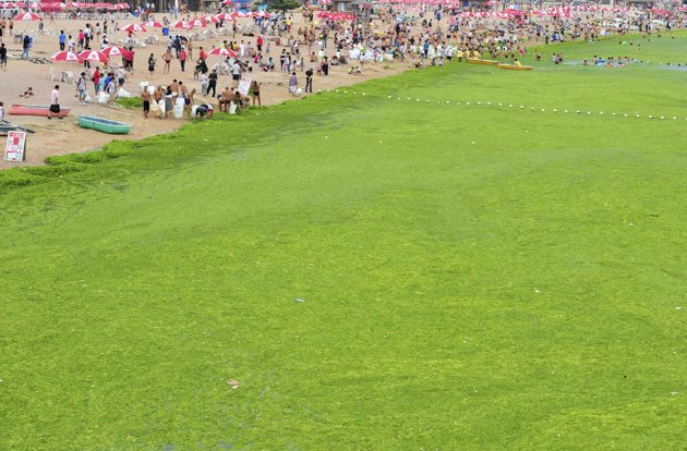 Die chinesische Stadt Quingdao wird dieser Tage von einer wahren Algenplage heimgesucht. Ein riesiger, grüner Teppich bedeckt weite Teile des Meeres. Während sich viele Chinesen nicht vom Baden abhalten lassen wollen, diskutieren andere bereits über die Ursachen der Algenexplosion und Zusammenhänge mit einem Öl-Unfall Hoffentlich haben wir so was nicht auch eines Tages in Europa ![]()