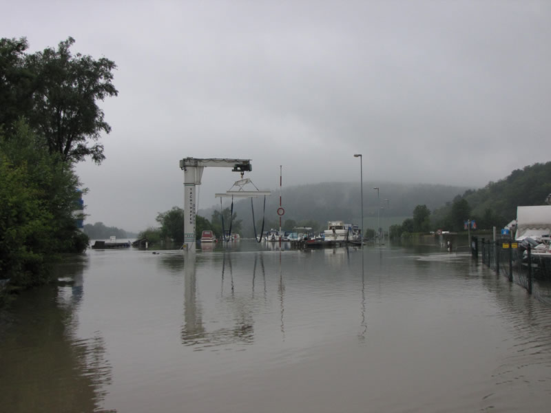 In Schlögen steigt das Wasser stetig. War heute, nachdem ich gestern Abend mein Boot rausgenommen habe, auch tagsüber drüben. Am Foto der ASKÖ Steganlage sieht man recht gut, wie viel das Wasser von Sonntag ca. 17:00 (Foto meines vorangegangenen Beitrags) bis Montag ca. 14:00 (dieses Foto) gestiegen ist. Zum Vergleich hab ich auch ein Foto mit Normalwasserstand April 2013 beigegeben - als wir gerade die Holzbeplankung neu gemacht haben. Die Steganlage der Marina hält sich nach meinem Informationsstand recht gut. Habe von keinen Problemen gehört. Der Campingplatz hat leider seine ersten "Opfer" in Form vollgelaufener oder aufschwimmender Wohnwägen zu beklagen. War heute um ca. 21:00 noch mal vor Ort. Der Wasserstand hat leider erneut zugelegt und nun die zweite Ebene der Campingterrasse erreicht. Der eine oder andere Wohnwagen der darunterliegenden Ebene braucht wohl nimma gar so viel um sich in die Donau zu verabschieden - sofern sie nicht an der überspülten Hecke oder sonstwo hängen bleiben.
