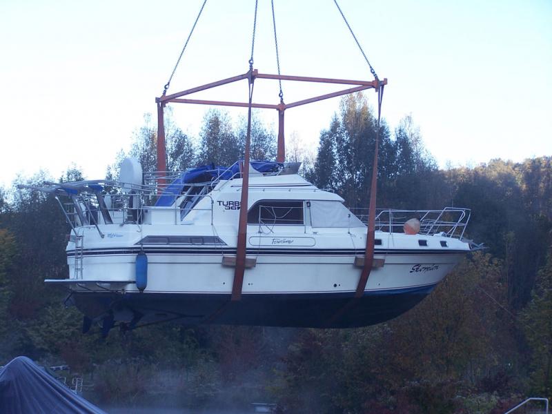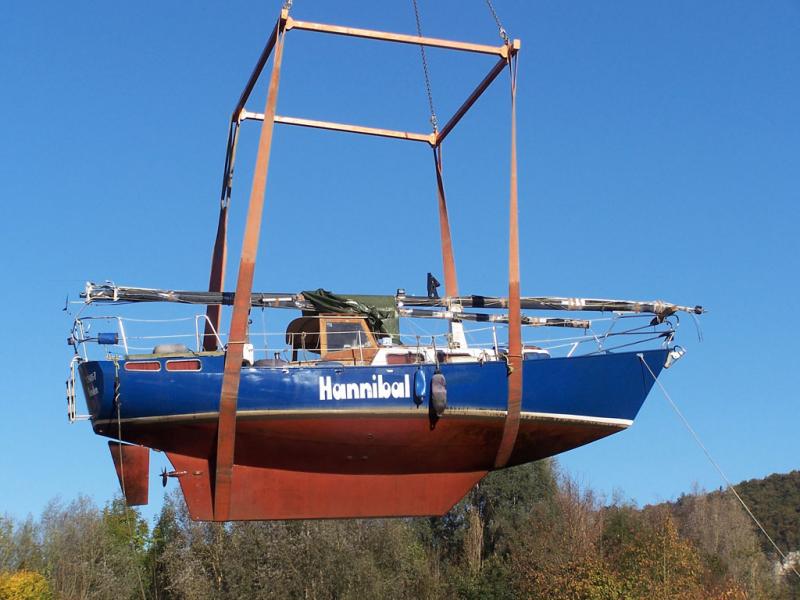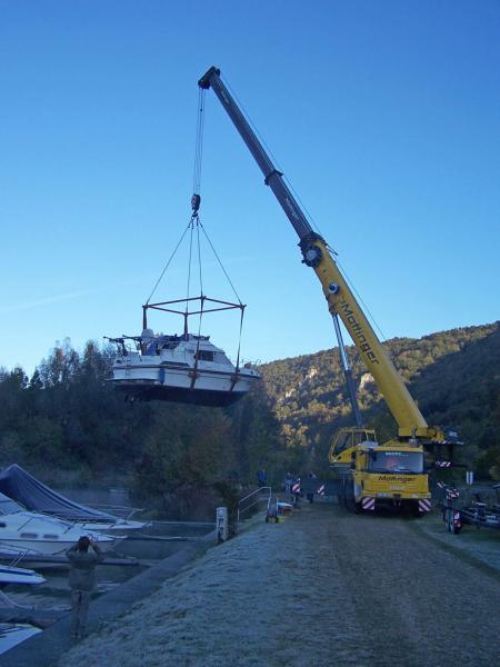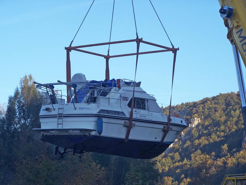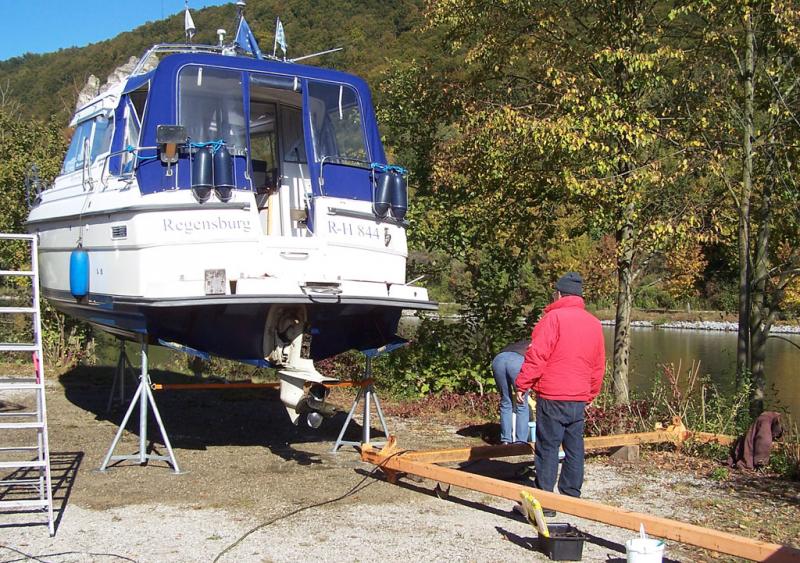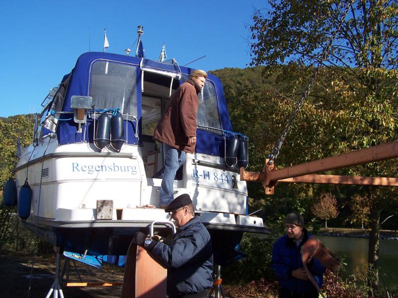 Nachdem die Stellage für Hannibal fertig war, kam Tom's Boot an die Reihe. Kleines Problem: Die Traverse ist für große Boote ausgelegt und sitzt daher bei dem Kurzen zu weit Aussen. Sigi findet eine Lösung: die Gurte mit Tauenden einfach am Boot festbinden.Der Zimmermann hatte auch für Tom einige Balken dabei, so dass auch hier das Boot auf ebenem Kiel und an Land steht. Jetzt gab es erstmal einen Imbiss, den Elena wie immer sehr nett vorbereitet hatte: Weißwurscht mit Senf und Brezen, dazu Kaffee (für mich) und leichtes Weizen für die Herren. Anschließend wollte der Herr Ruinenstadtschiff unbedingt wissen, was er machen muss, um die Palmyra winterfest zu bekommen. Auch das ist geschafft, sogar in sehr kurzer Zeit, dass Kühlwasser geht noch bis -30°C und den Aussenkreislauf haben wir mit Glysantin vom Sigi aufgefüllt, bis es dem Antrieb wieder aus den Löchern gelaufen ist. Impeller natürlich auch ausgebaut. Die nächsten 10  |