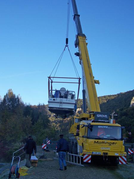 Also, die Traverse ist zusammengeschraubt, der Kran an seinen Platz gefahren und die Stützen ausgefahren.  Dann kommt der "Skorpion" an die Traverse. Die nächsten 10 Bilder ![]()  |