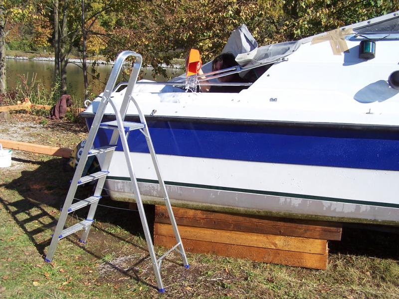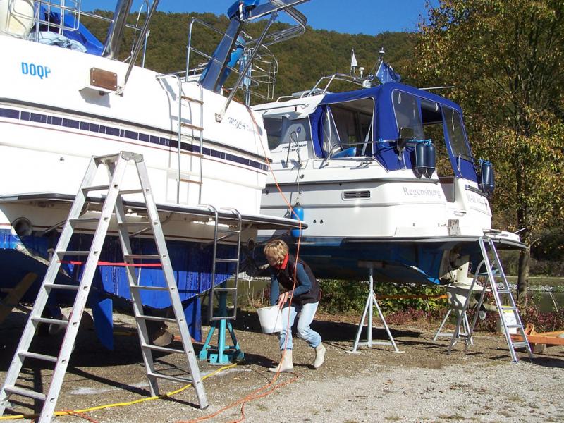 Die Zimmerleute, übrigens der Eigner vom Skorpion, hat sofort losgelegt und ein Gestell gezimmert, so das Hannibal auch bei einem Erdbeben sicher auf dem Kiel stehen bleibt. ![]() In der Zwischenzeit erledigt der Peter Hausherrenarbeiten mit dem Hochdruckreiniger, während Rosi auf der anderen Seite heftig an den Bordwänden schrubbt. Auch den Antrieb hat sie, zwar noch ganz umweltfreundlich, aber doch schön sauber bekommen. ![]() Das Ganze hat so um die 30 Minuten gedauert und die Stellage war fertig. Seht selbst: Nochmal 10  |