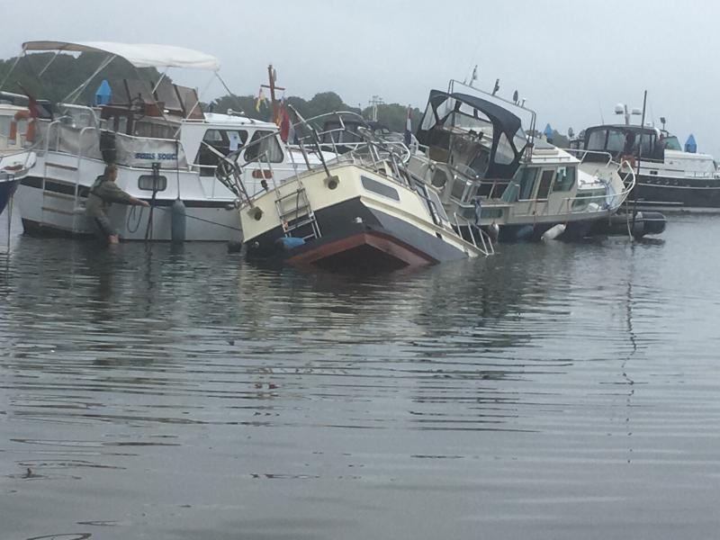 Unser „Verlust“ liegt genau an der Kante, wo der Flachwasserbereich anfängt. Darum liegt das Boot mit dem Bug tief unten, aber das Heck steht schräg nach oben (entsprechend dem Geländeverlauf) Unser Plan für nach dem Hochwasser: wir ziehen das Boot mit den Campingplatz-eigenen Radladern über die Kante in den Flachwasserbereich und pumpen es leer. Abgesoffen ist das Boot über die seitliche Lüftung, die schon einige Zeit unter Wasser war… Als wir ankamen, wurde das Boot durch die Achterleine in der Schwebe gehalten. Um das Boot zu bewegen haben wir wir Vor- und Achterleine durchtrennt - aber das Boot ist nicht in Schwimmlage zurück gegangen. Durch das Trennen der Achterleine ist das Boot hinten hoch und mit dem Bug unter Wasser gegangen und ist dann - so unsere Theorie - über den Ankerkasten abgesoffen…. ![]() Die Moral von der Geschichte: überlegt es euch 3 mal, bevor ihr die Achterleine löst…! „Bilgenwasser“ könnte nach vorne strömen und … - siehe oben…🙈🙈 Natürlich wird es von der Bergungsaktion Fotos geben - mal sehen, ob es klappt… Unser Freund hat es gelassen genommen. Die Vorgehensweise mit dem Hafenmeister abgestimmt und…. ist wieder in Urlaub gefahren - schließlich war das Hotel bezahlt… ![]()